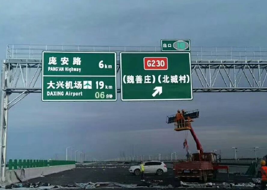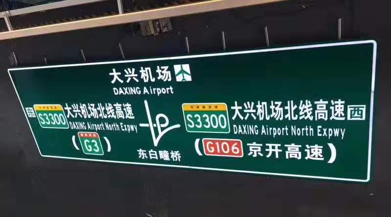 北京大興國際場外圍道路已重新規劃布局,相應道路拖延延伸,路徑指引標志系統采用最先進的LED主動發光交通標志,標志實現時空同步,同一塊標志中既顯示到達大興機場距離,又讀取高德通行數據,測算出平均車速,給出達到大興機場的時間,方便駕駛人員有效規劃路徑、全天候視認標志版面,目前已全部完工、交付。