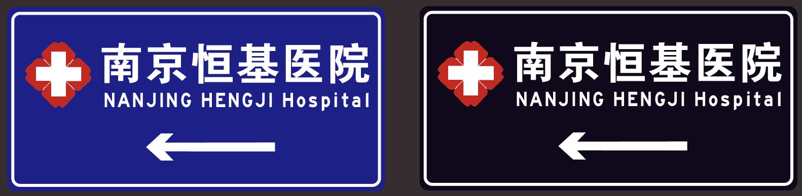 1、指示標志。在醫院周邊的主干道上,根據實際條件,可設置遠距離預告標志,或將醫院指示信息融入指路標志版面;在臨近醫院入口相交的市政道路上,設置醫院指示標志。可采用主動發光標志。(下左圖:白天效果;下右圖:夜晚效果)
