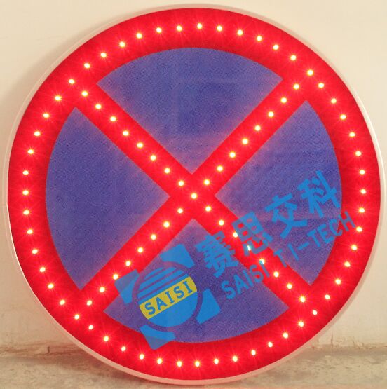 禁令類道路交通發光標志牌,其主要功能為宣告路段或區域內,通行車輛的屬性、駕駛行為、通行軌跡的行政管理指令。如:“限制速度標志”、“禁左標志”、“禁停標志”、“禁止鳴笛標志”、“禁止超車標志”、“限制高度標志”、“限制貨車通行標志”等。其形狀通常是圓形、單面八角形或等邊的自上而下的三角線,其形狀通常是白色底部、紅色圓圈、紅色斜桿和黑色圖案,"禁止停車標志"為藍色底部、紅色圓圈、紅色斜桿。該類標志,通常選用“全透面板型主動發光標志”、“外置點陣型主動發光標志”等類型。
