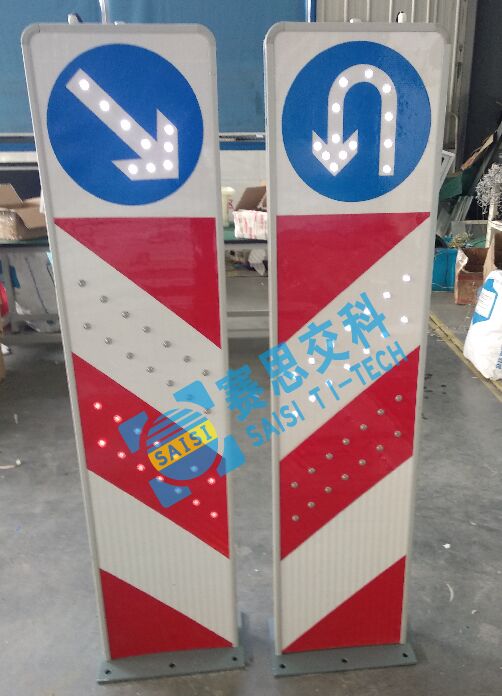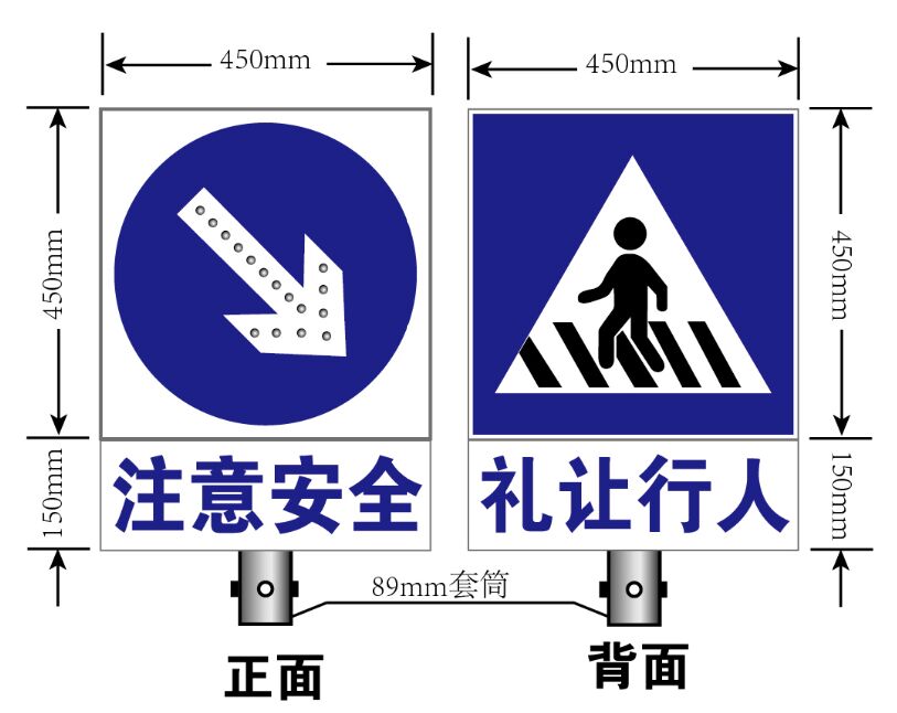 在交通安全工程中,為了讓某區域根據不同的車流方向設置不同的路權,需要在入口顯眼處設定雙面標志牌,方便不同方向的車流觀察、確認,如中央隔離帶缺口處,設置雙面太陽能標志牌,一面為“允許掉頭”,另一面為“禁止掉頭”,用于區分來、去車輛的掉頭權利。當然,也存在這樣的雙面太陽能標志牌,正面為主標志信息版面,背面為“謹慎駕駛、注意安全”等交通安全宣傳標語。