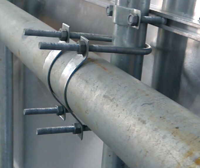 5、將圓管用U型卡箍在懸臂上下對(duì)卡,用對(duì)應(yīng)懸臂尺寸的抱箍半片固定于懸臂左右上,用M12螺帽固定。