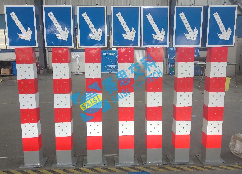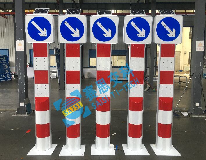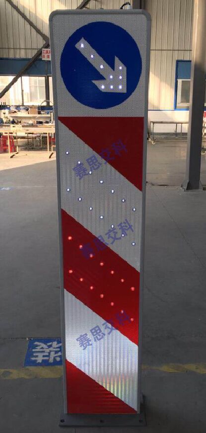 太陽能右下行發光警示柱(樁),采用外置超高亮LED發光二極管,對頂部右下行標志圖案輪廓進行發光描邊,且標志柱體均設置斜向紅白相間反光膜,也配置了發光管,標志體整體采用太陽能供電,通過內置控制芯片,實現動態閃爍,或常亮的工作模式,較普通標志,具備更強的警示性,和遠距離視認性,經測試,太陽能右下行發光警示柱(樁),在夜晚環境中,靜態視覺距離大于400米;動態視認距離大于300米。