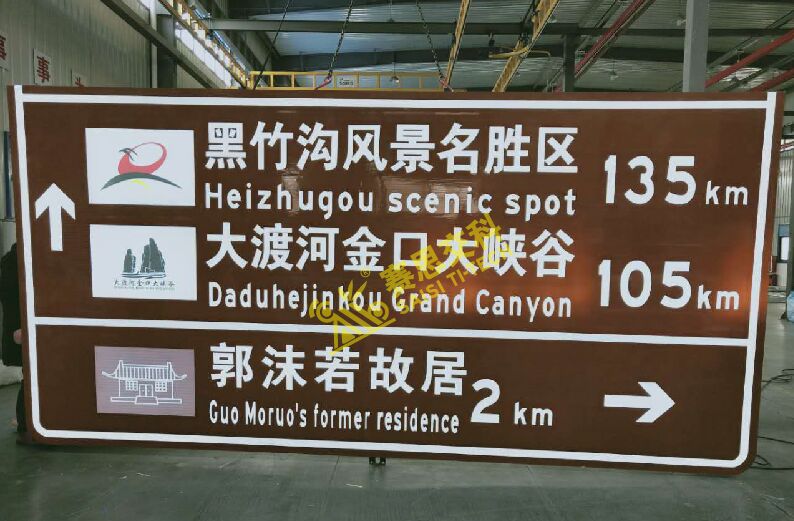 采用主動(dòng)發(fā)光工藝的旅游標(biāo)志牌,其版面通常由:風(fēng)景點(diǎn)名稱文字、預(yù)告距離、引導(dǎo)方向箭頭、風(fēng)景區(qū)圖片LOGO等組成,標(biāo)志底板采用棕色反光膜(旅游標(biāo)志專用膜)。標(biāo)志主動(dòng)發(fā)光工藝,采用內(nèi)置光源定向投射標(biāo)志面板,形成自主發(fā)光的效果。其優(yōu)點(diǎn)主要有: