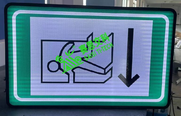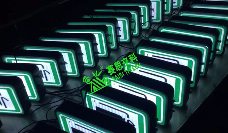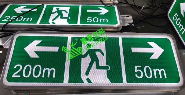 隧道雙面全透電光標志,面板采用專用透光材質;背板采用鋁制板材;抱邊結構采用專用的模具成型鋁制結構;面板圖案文字部分,主要分兩種:(1)國標IV類反光膜;(2)UV專用圖案打印(不反光)。其安裝通常采用L型支架架構,側裝于隧道內壁。光源采用專用內置照明超亮燈珠,內部投射于標志表面,形成發光效果。