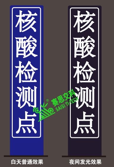 為做好新冠疫情防控,全國各個城市、鄉村都設置了大量的核酸檢測點,方便居民及時參與、配合核酸檢測。根據不同城市疫情的各自嚴重形勢,通常會出現全員核酸、或應檢盡檢的檢測要求。居民們白天需要上班工作,通常會選擇下班后才去做核酸。在夜晚,為方便對核酸檢測點進行有效指示,特設計本“核酸檢測點”發光指示標志,具體參數如下: