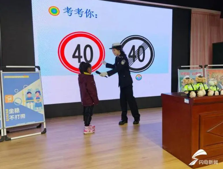 “生動活潑,入腦入心”。民警通過ppt為同學們介紹了各種常見的交通標志、標線,例如“一盔一帶”,“安全帶是生命帶”、“細觀察,不猛跑”等。同時,民警還開展了有獎互動,為答對問題的小朋友送上交通安全文創產品。