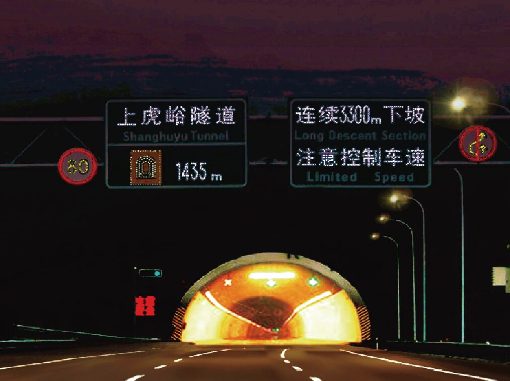 因此,在有條件的情況下,隧道及進出路段所有交通標志均宜采用Ⅴ類大廣角反光膜,或者采用主動發光型交通標志,以提升交通標志的遠距離、大角度、全天候視認功能,并通過科學、合理地增設基礎交通安全設施,消除特殊交通環境所衍生的安全隱患,提高隧道內行車安全、秩序和通行效率,降低交通事故發生率,保證整個運輸系統的健康運行。