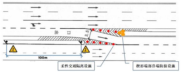 (4)應(yīng)在出口三角楔形端部鼻端處安放必要防車(chē)輛碰撞設(shè)施,最簡(jiǎn)易的操作即3個(gè)防撞桶;并建議在此處安裝一盞霧燈(持續(xù)閃爍)或一塊(兩側(cè)通行)太陽(yáng)能點(diǎn)陣式線形誘導(dǎo)標(biāo)(即太陽(yáng)能道口標(biāo))。